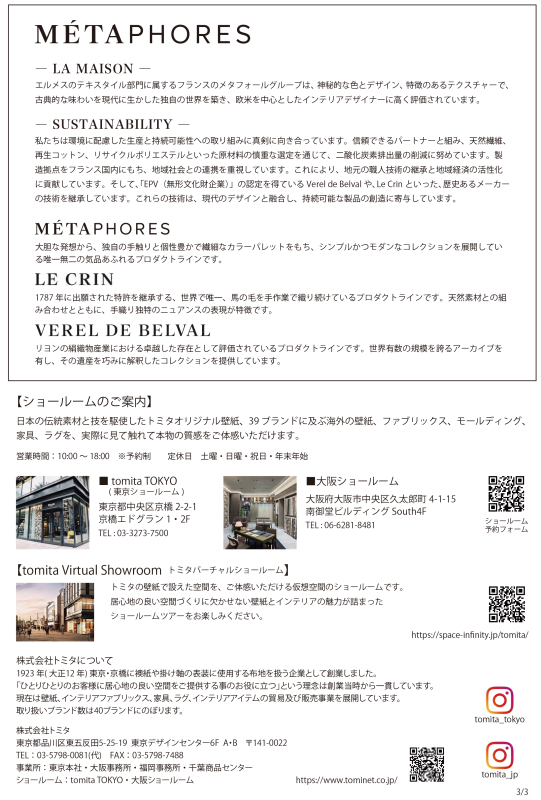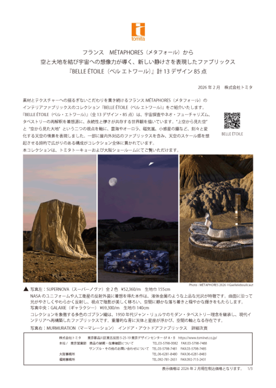 ㈱トミタのショールームtomita TOKYO、大阪ショールームに、素材とテクスチャーへの揺るぎないこだわりを貫き続ける、フランスMÉTAPHORES(メタフォール)の新作コレクション『BELLE ÉTOILE(ベル エトワール)』が入荷いたしましたので、お知らせいたします。