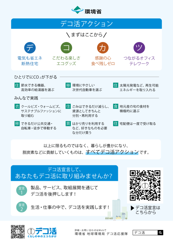 これは、環境省が推進する「脱炭素につながる新しい豊かな暮らしを創る国民運動」の一環であり、デコ活(脱炭素=Decarbonization/エコ=Eco/活動=Activity)の実践を加速させ、2050年カーボンニュートラルの実現を目指す行動宣言です。